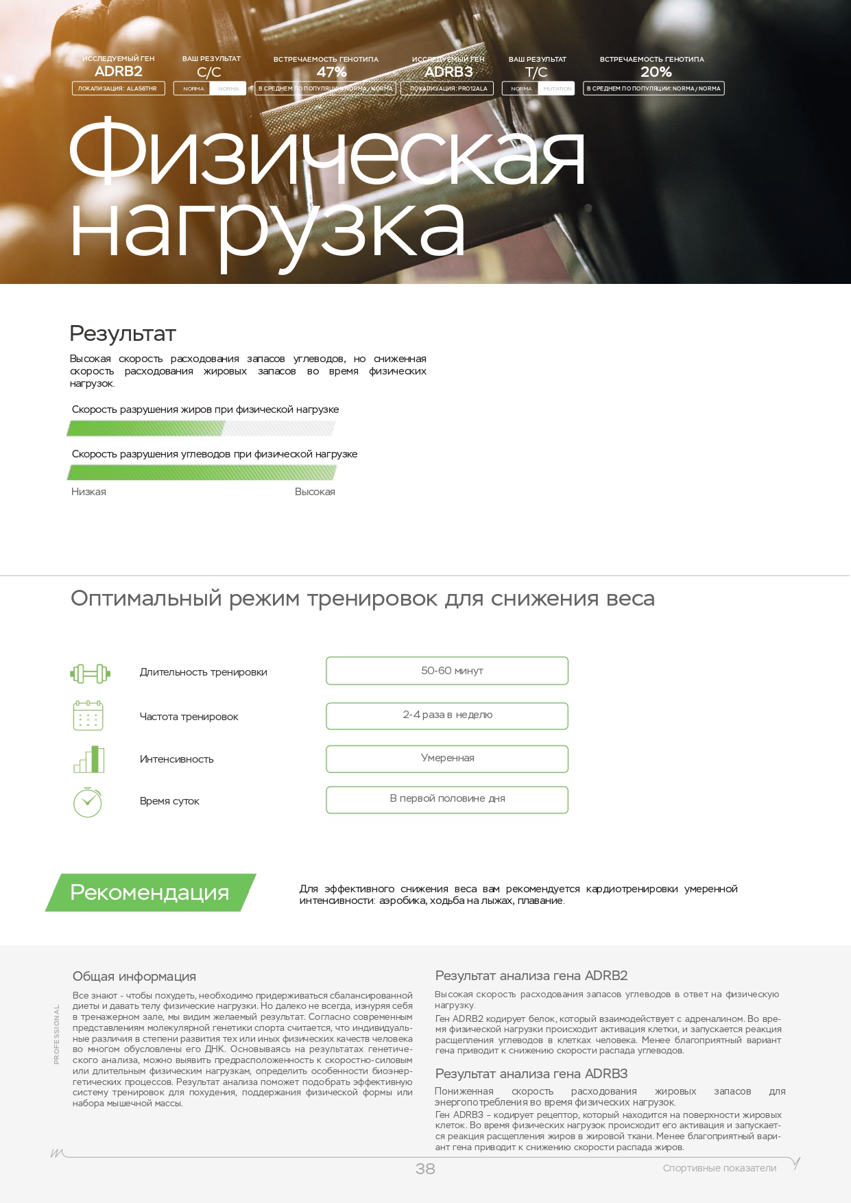 Помните, что помимо физических нагрузок большую роль играет питание. Вы также можете пройти ДНК-тест на диету, который покажет, каких веществ не хватает в организме, какие организм усваивает лучше, а какие хуже и многое другое.